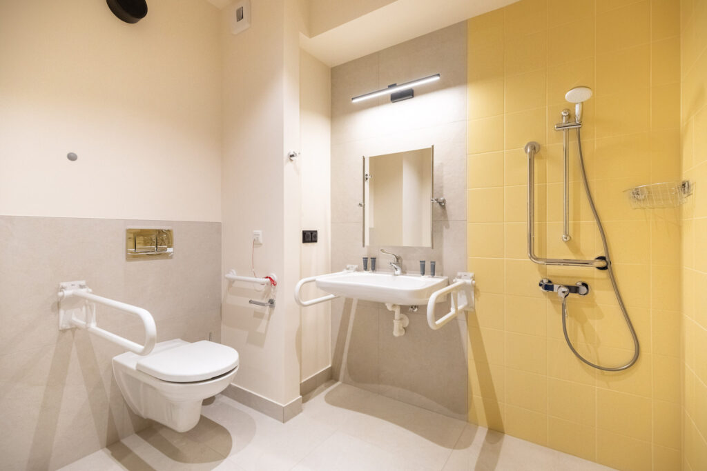 Parmi les équipements les plus importants, on trouve des chambres spacieuses accessibles aux fauteuils roulants, des salles de bains avec poignées et un bac à douche sans seuil, des ascenseurs à chaque étage et des portes d’entrée à ouverture automatique. L’emplacement des dortoirs à proximité des lignes de tramway, adapté aux besoins des personnes à mobilité réduite, est également important.